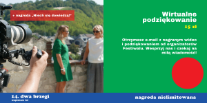 Chcąc odwdzięczyć się za każdą Waszą wpłatę, przygotowaliśmy dla Was długą listę nagród — jest ich 50! Powstała ona w dużej mierze dzięki udziałowi Partnerów i Przyjaciół Festiwalu — instytucji i firm, ale także osób prywatnych. Wszyscy oni przekazali swój czas lub efekty swojej pracy na cel tej zbiórki. Dziękujemy!